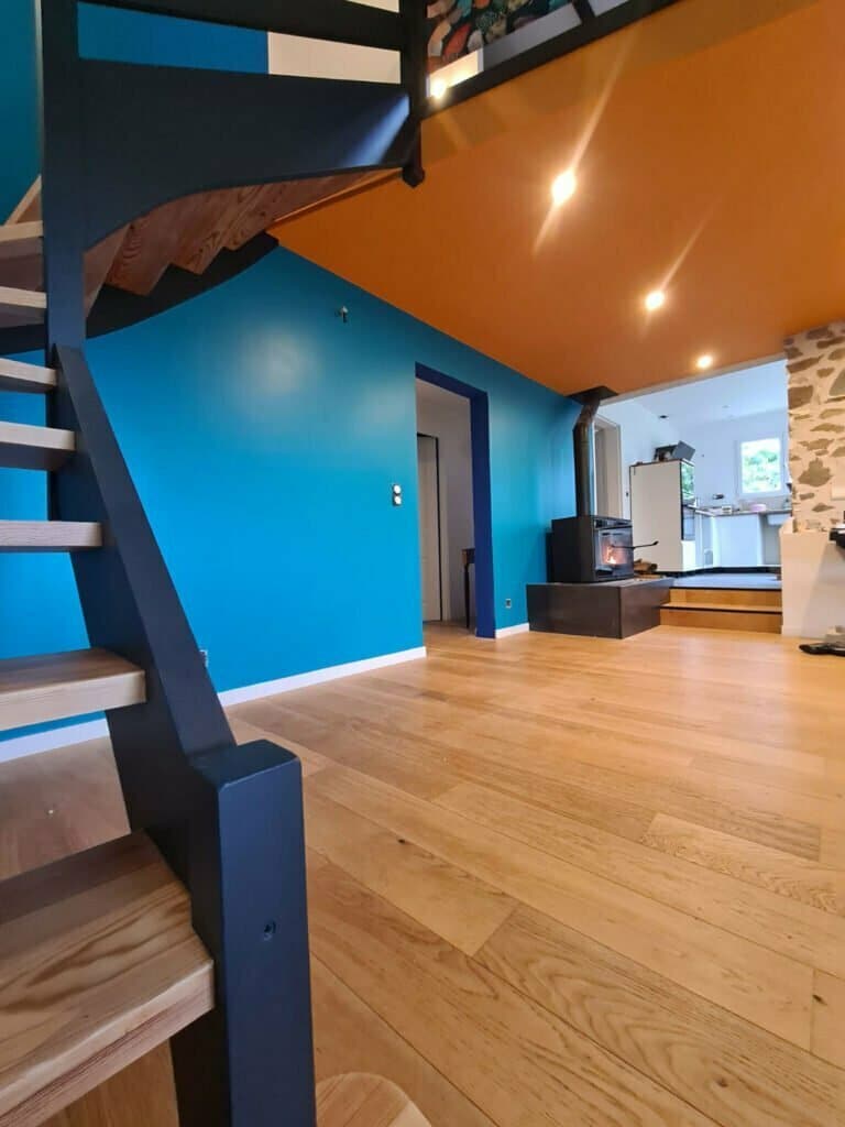 j’ai réalisé un rafraîchissement du plafond avec poutre en noir mat. Cage d’escalier remise à neuf des murs en bleu velours avec une bonne préparation ainsi que le plafond jaune qui laisse place au orange.