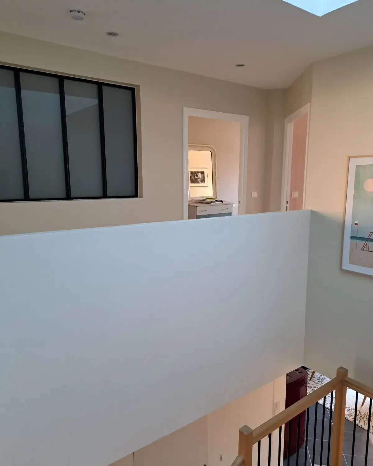 Pour cette cage d’escalier et palier, il fallait faire une bonne préparation des murs car ils étaient en enduit de décoration et on repartait sur des murs lisse. La finition des murs a été réalisée en peinture velours.
