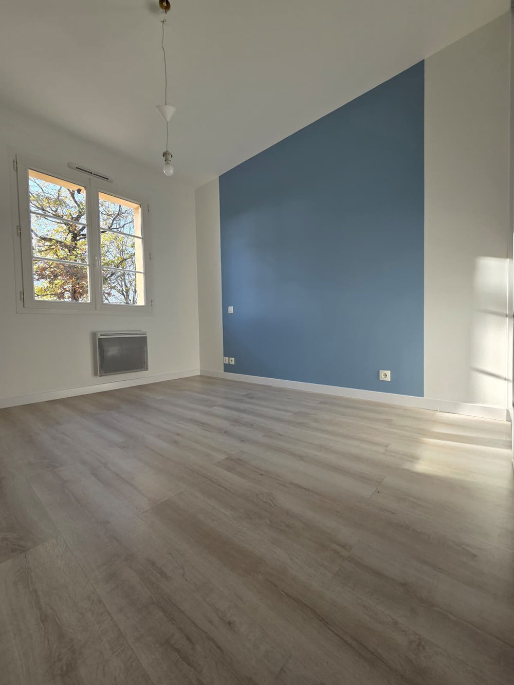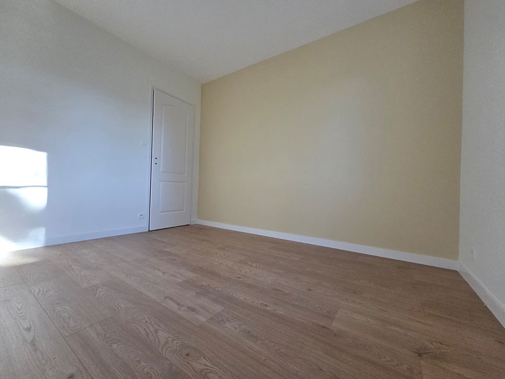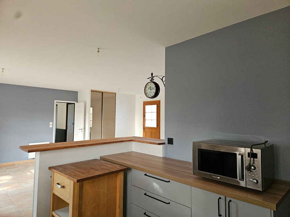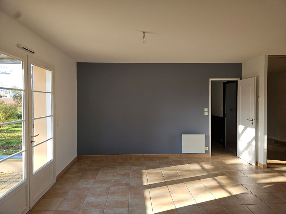 Rénovation complète d’une maison en peinture et sol sur La Régripière avec de la couleur.